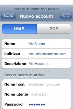 Attenzione: queste schermate sono riportate solo per esempio e indicano nomi server di fantasia (pop.miodominio e smtp.miodominio) per i server netcom, utilizzate al loro posto i parametri mail.nomedominio.it in entrambe le voci. Per SMTP come detto sopra, usate quello del vostro fornitore di accesso (TIM, Vodafone, Wind eccetera) se volete accedere dalla rete mobile