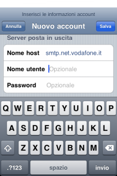 NOTA: Per questi account di posta l'impostazione è assistita dall'iPhone in quanto sono già prememorizzati i parametri utilizzati dal provider e devi inserire solo quelli legati alla identificazone della tua email: username e password.